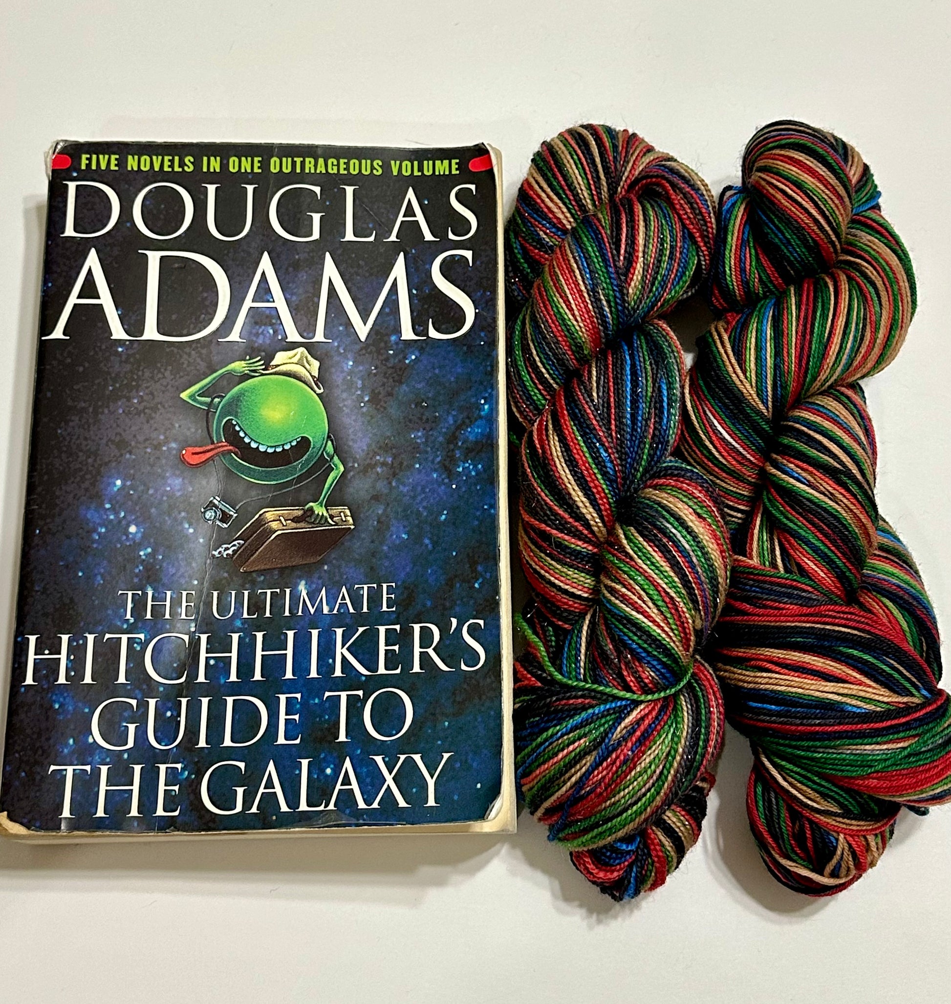 Discover the answer to life, the universe, and everything with our "42" self-striping yarn, an homage to *The Hitchhiker's Guide to the Galaxy*. This vibrant, hand-dyed yarn captures the essence of Douglas Adams' iconic universe in every stripe.