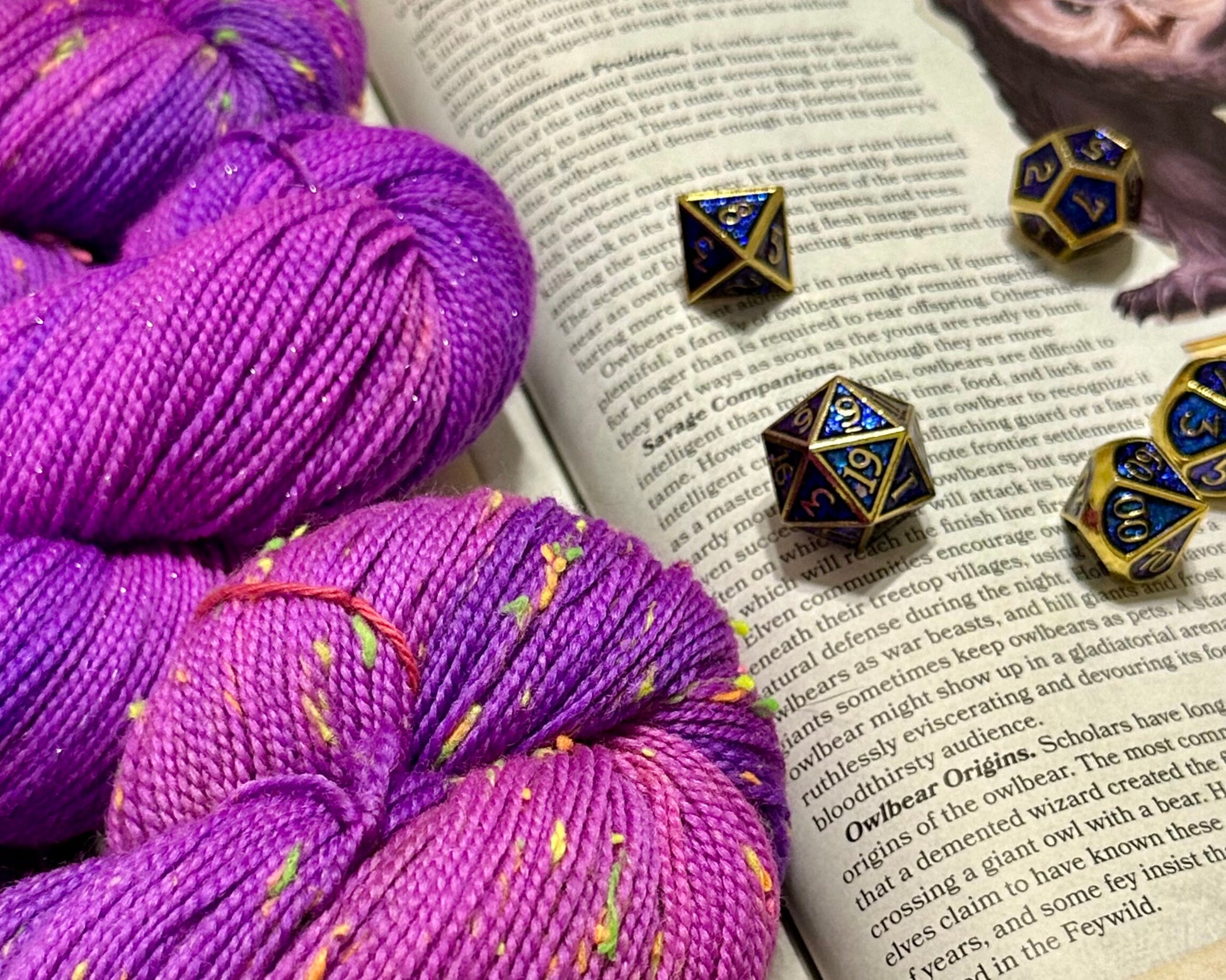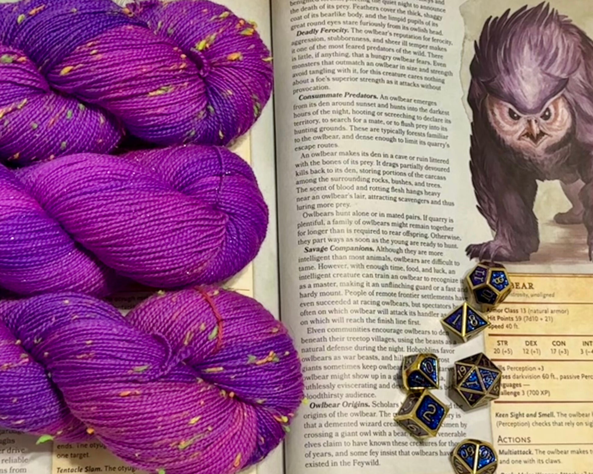Owlbear’s Roar is a neon purple hand-dyed yarn, as fierce and unforgettable as the monster that inspired it. This colorway is built for projects that demand attention: socks that strike with talon-sharp boldness, shawls that shimmer like enchanted feathers, sweaters that roar from across the room.